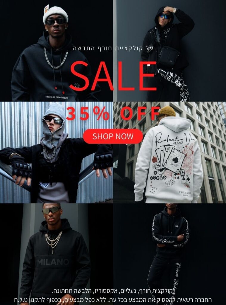 Backpacks SHOP NOW Sneakers SHOP NOW SHOP BRANDSHOP BY BRAND ROBERTO VINO W JEANS DUCK X SHARK SPORT מעיליםבשמיםתיקים NEW ARRIVAL35% הנחהבחר אפשרויותQuick ViewAdd to wishlistAdd to wishlist Quick Viewג'קט W JEANS 499 ₪324 ₪BLACK35% הנחהבחר אפשרויותQuick ViewAdd to wishlistAdd to wishlist Quick Viewג'קט ROBERTO VINO 579 ₪376 ₪BLACK35% הנחהבחר אפשרויותQuick ViewAdd to wishlistAdd to wishlist Quick Viewמעיל W JEANS 599 ₪389 ₪BLACK35% הנחהבחר אפשרויותQuick ViewAdd to wishlistAdd to wishlist Quick Viewמעיל צמר ROBERTO VINO 699 ₪454 ₪BROWN/WHITE סניקרסבשמיםמעילים Gallery