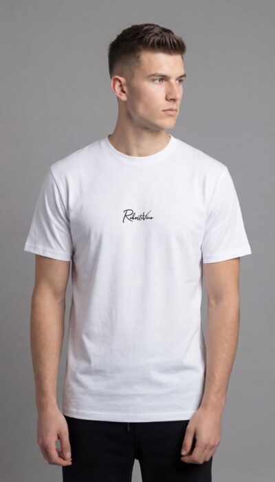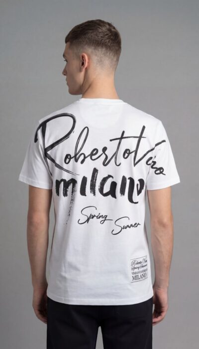 טי שירט לבנה עם לוגו ROBERTO VINO MILANO קדמי בגזרה נקייה ומראה יוקרתי.טי שירט לבנה עם לוגו ROBERTO VINO MILANO קדמי בגזרה נקייה ומראה יוקרתי.