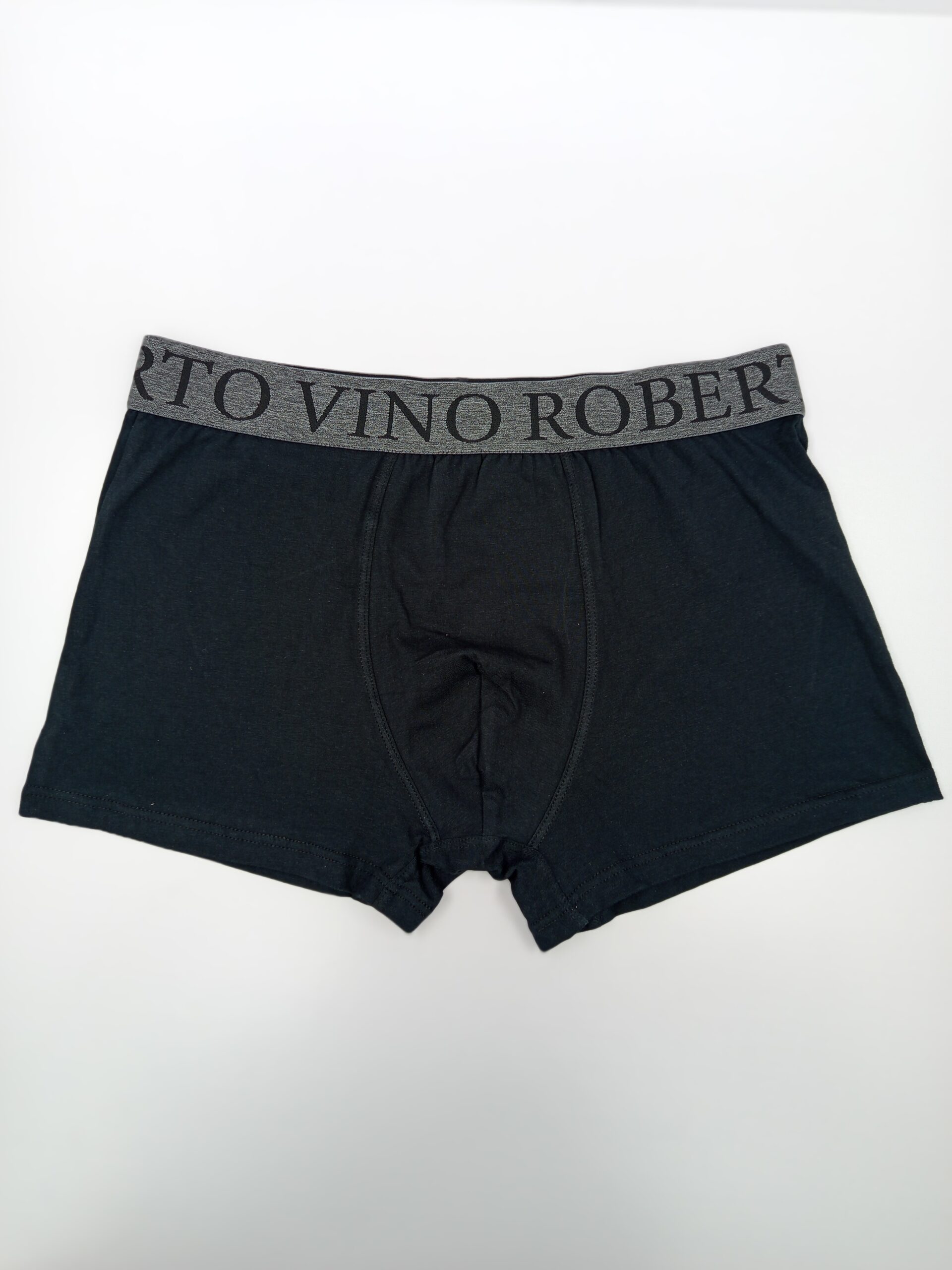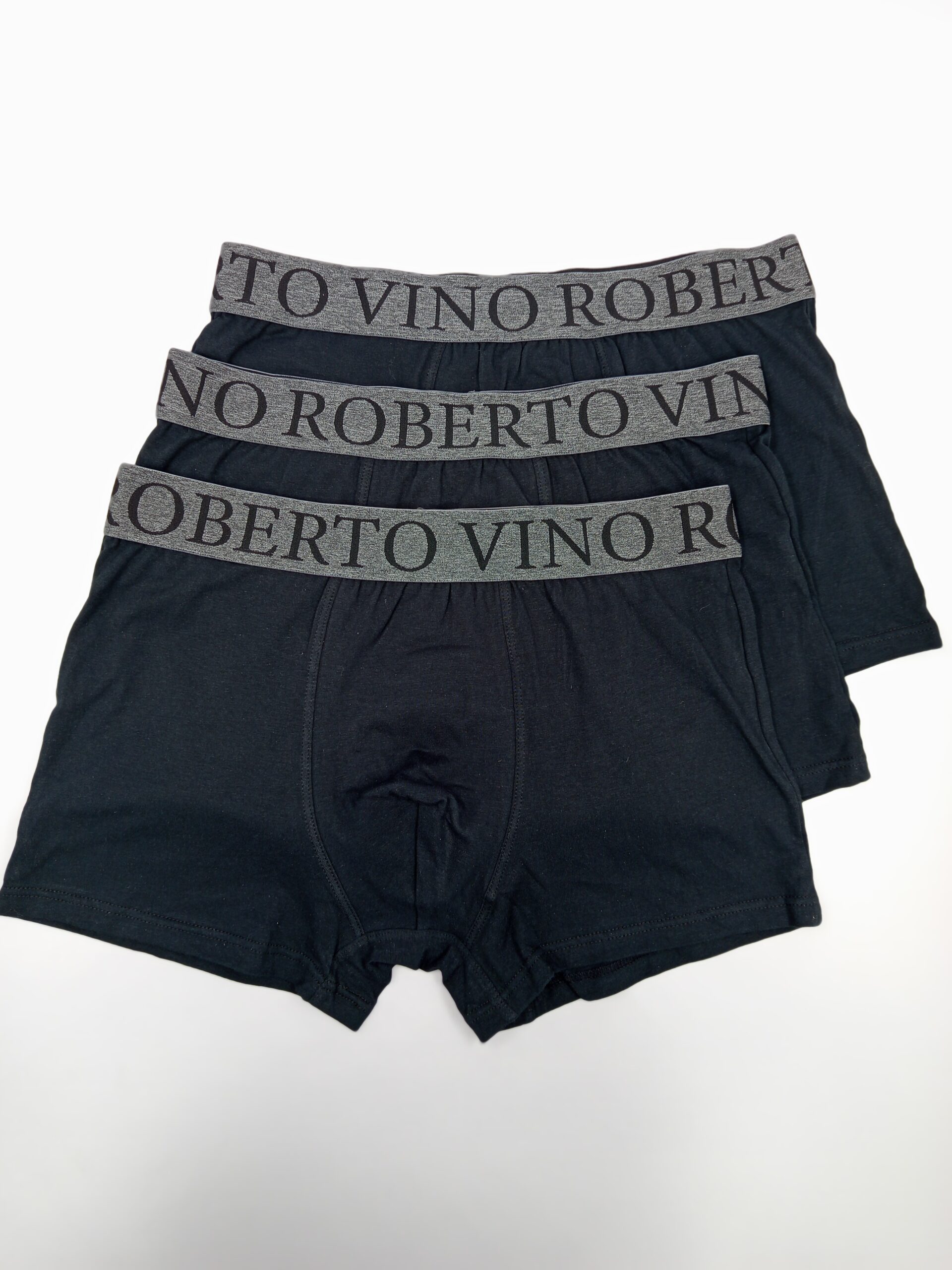 שלישיית תחתוני בוקסר מבית ROBERTO VINO בצבע שחור, עשויות מכותנה איכותית לגמישות והתאמה מיטבית. גומי מותני איכותי בצבע אפור עם לוגו בשחור מספק אחיזה יציבה ונוחות מרבית לכל היום.
