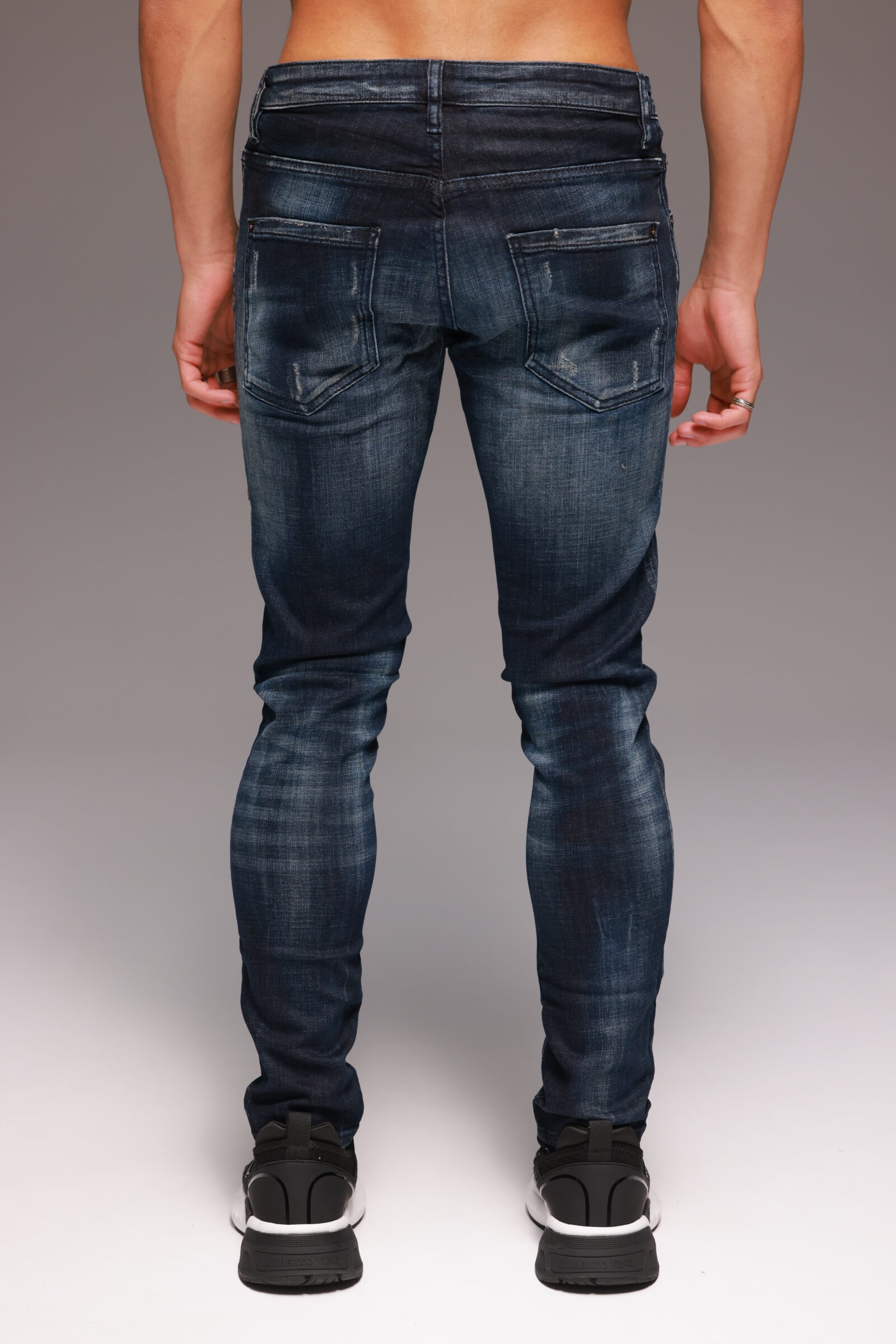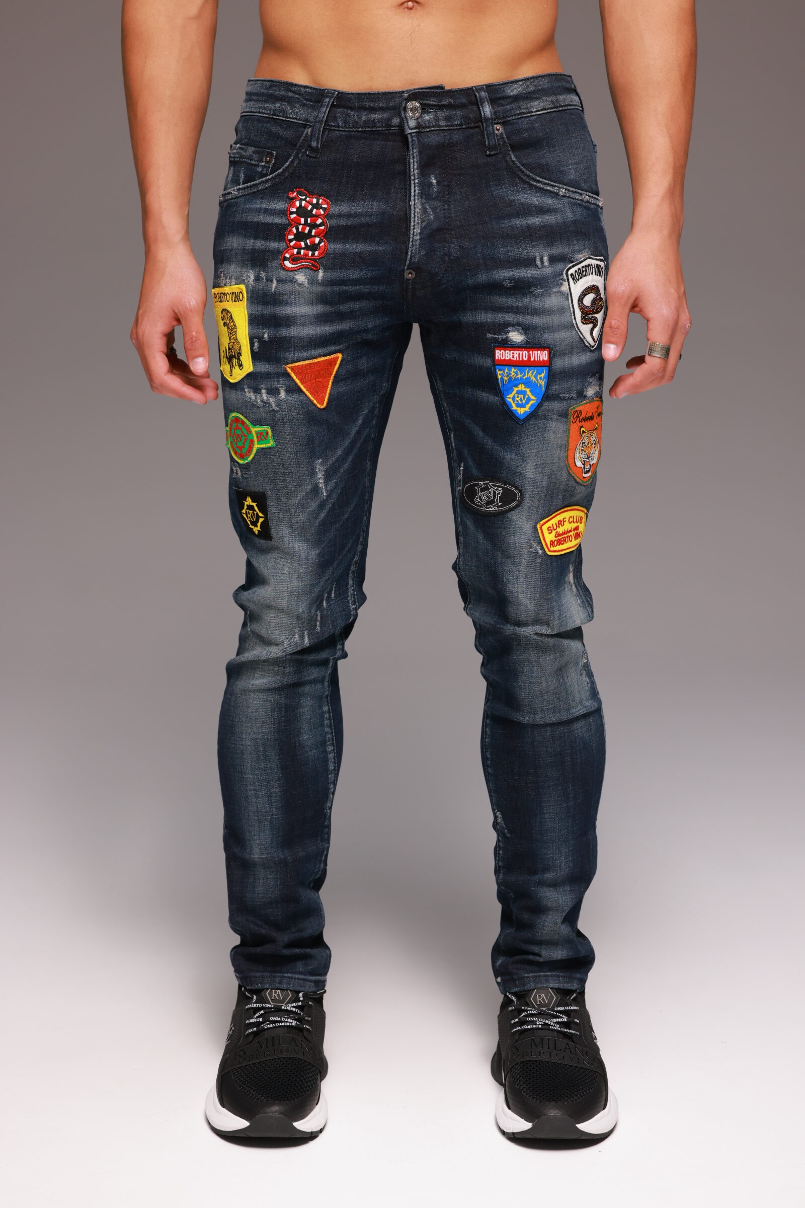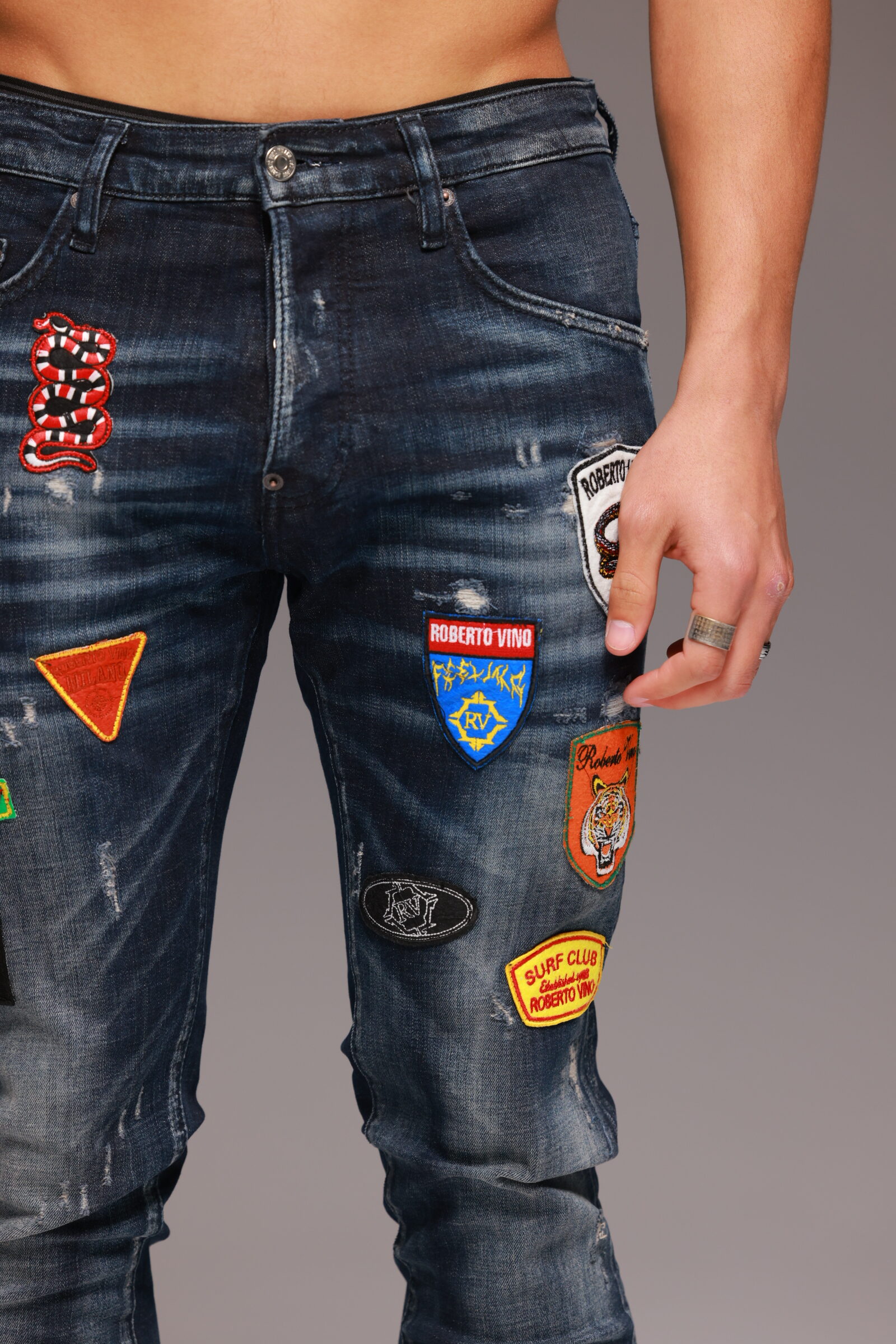 ג’ינס מבית ROBERTO VINO מביא סטייל נועז עם גזרה סקיני מחמיאה. השטיפות הכהות, הקרעים הקלים והטלאים הרקומים יוצרים מראה אורבני מלא בנוכחות.