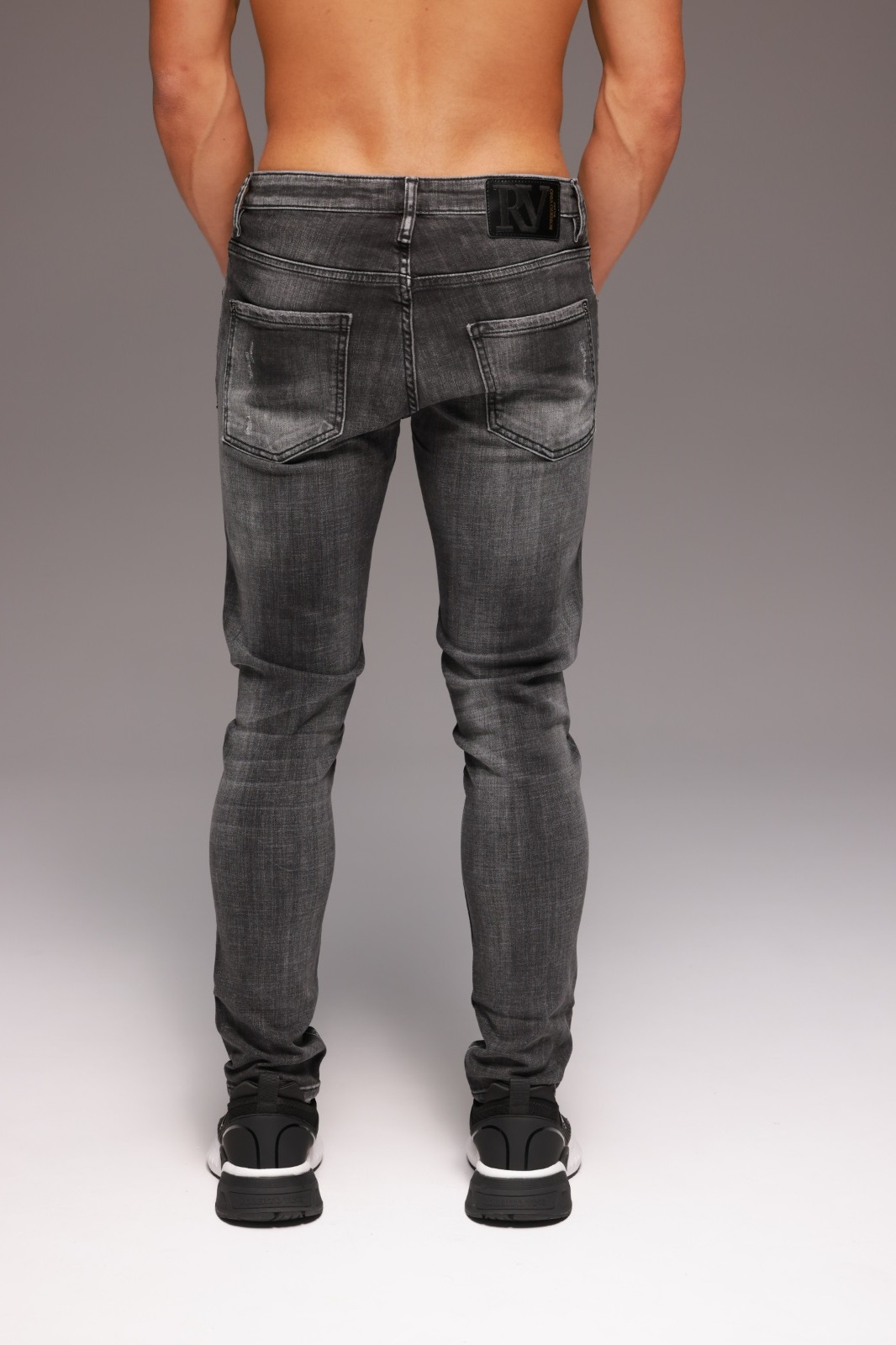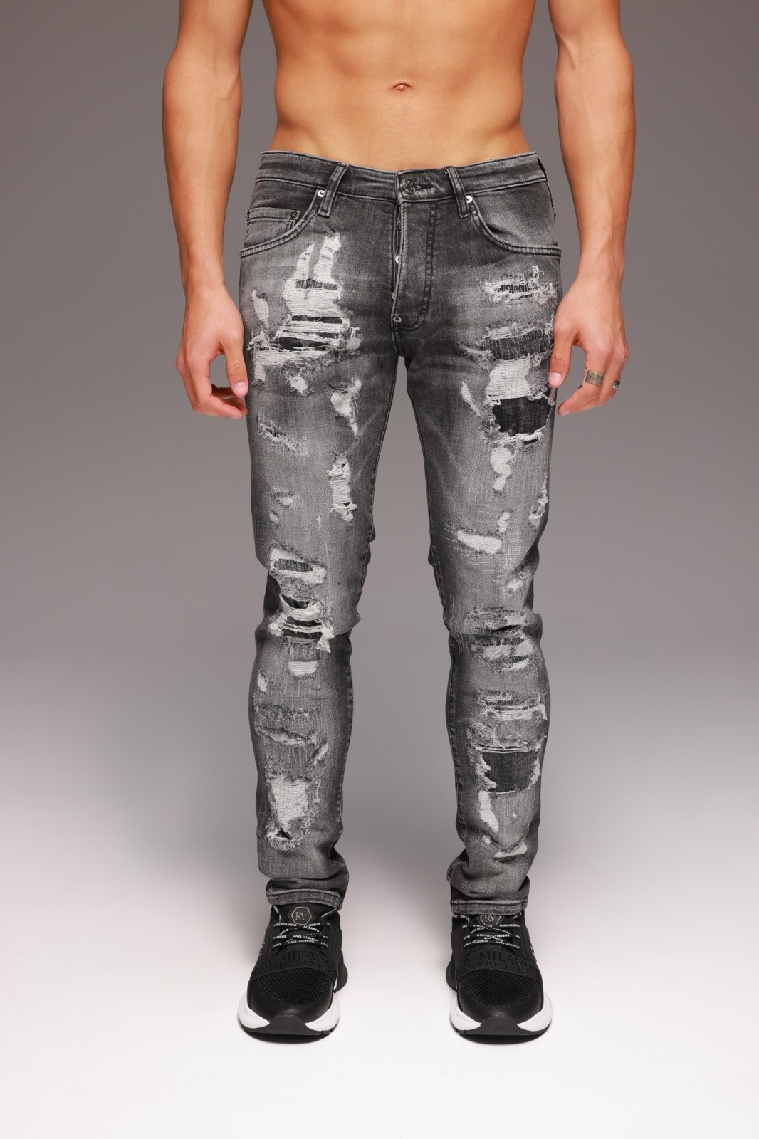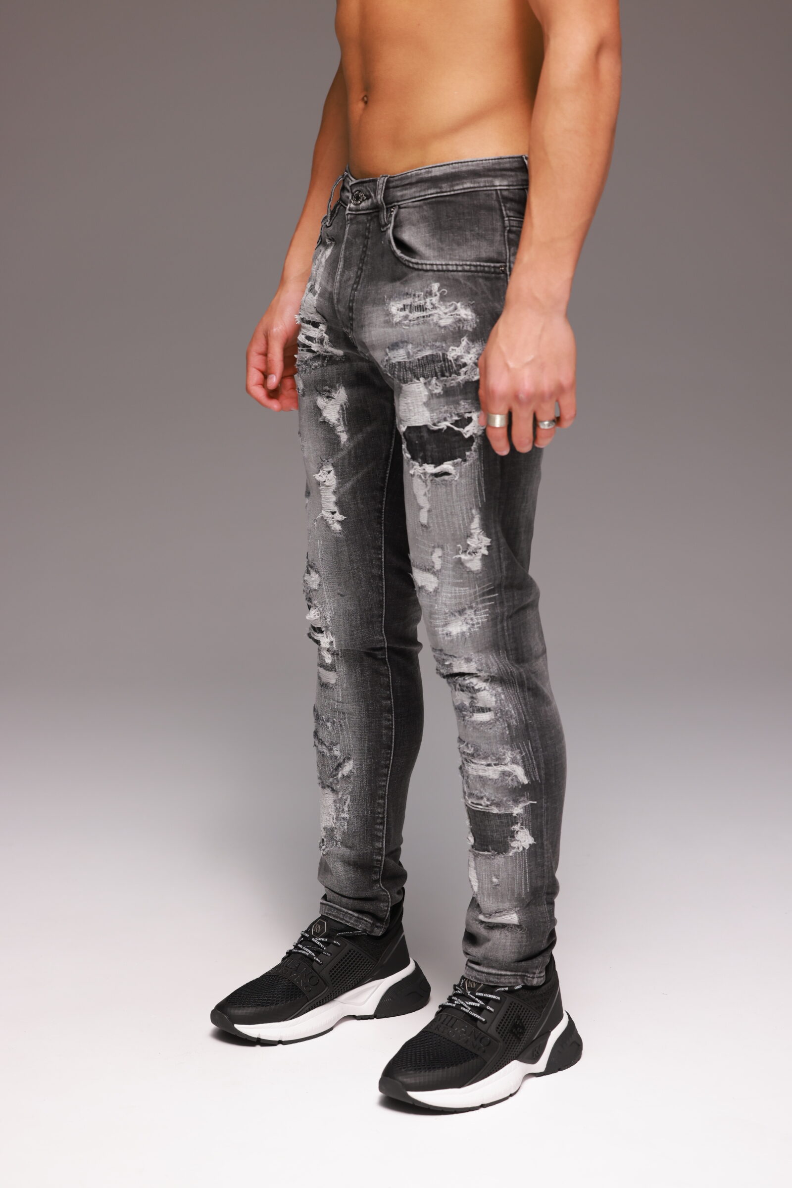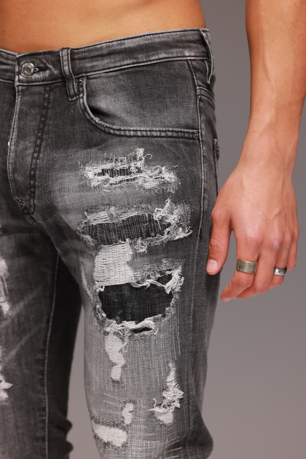 הג’ינס מגיע בצבע אפור עמוק עם קרעים לכל אורכו, אך ללא קרעים בגב. ניתן לשלב אותו עם חולצת טי לבנה ונעלי סניקרס ללוק יום-יומי מלא נוכחות, או עם חולצה כהה ונעלי עור למראה מחוספס ומרשים.