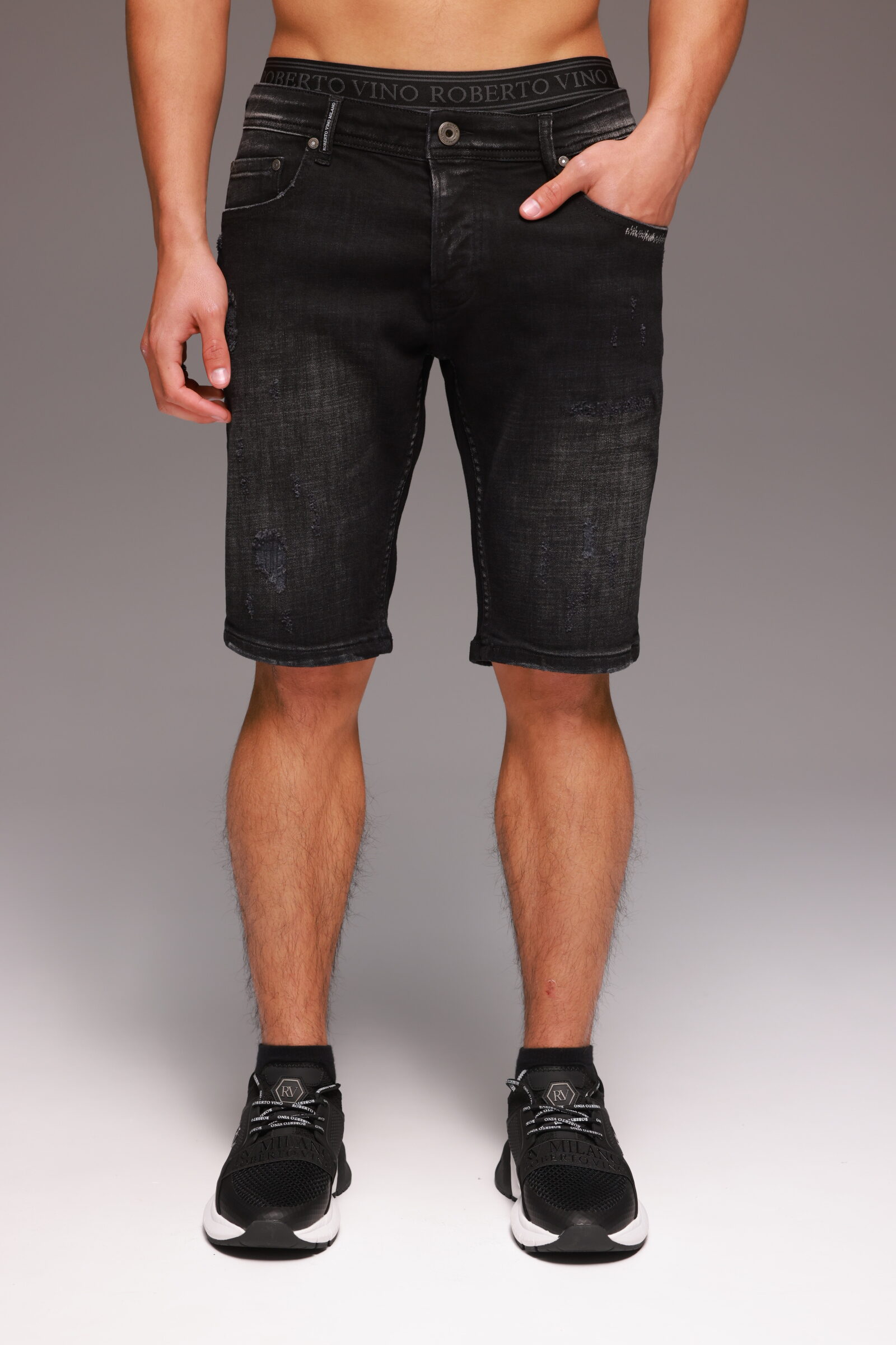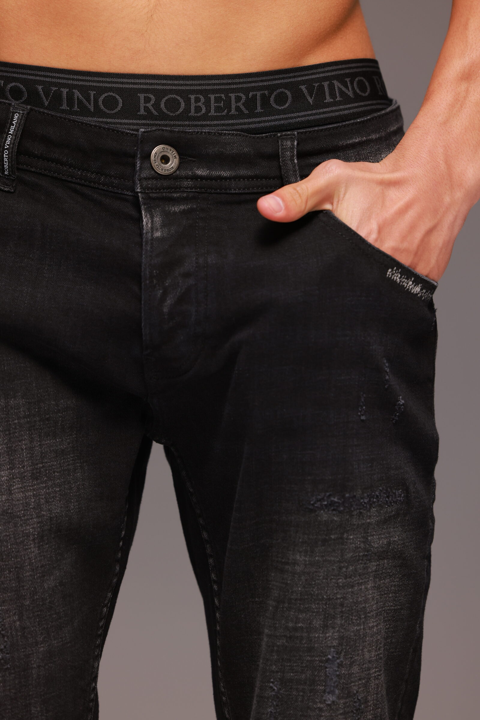 ברמודה ג’ינס של ROBERTO VINO בגזרה צמודה ומחמיאה. גוון פחם עם דהייה קלה ושפשופים עדינים יוצר לוק אורבני. עשוי מכותנה איכותית.