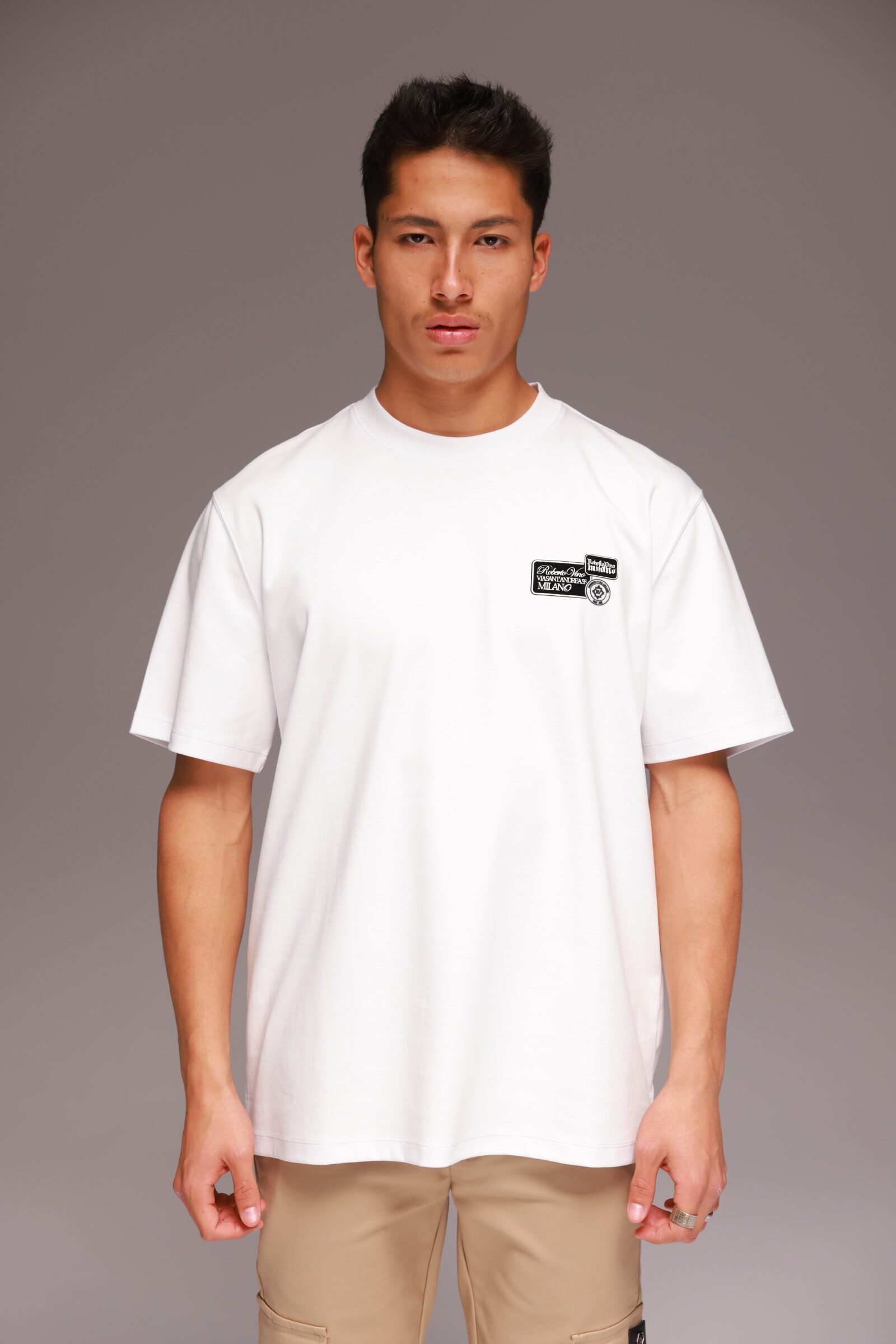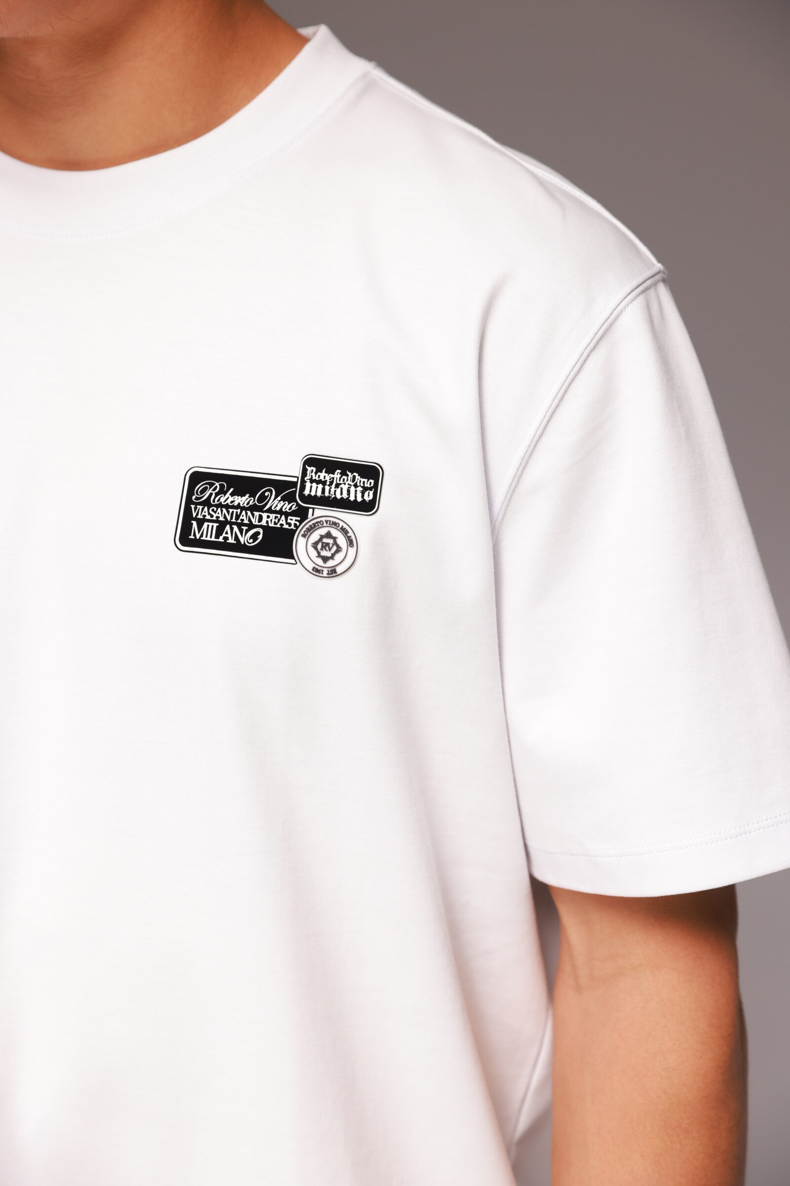 חולצת טי שרט מבית ROBERTO VINO בגזרה רחבה ומחמיאה. הדפס טקסט בולט בחזה מוסיף טאץ’ אורבני ייחודי.